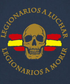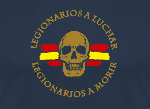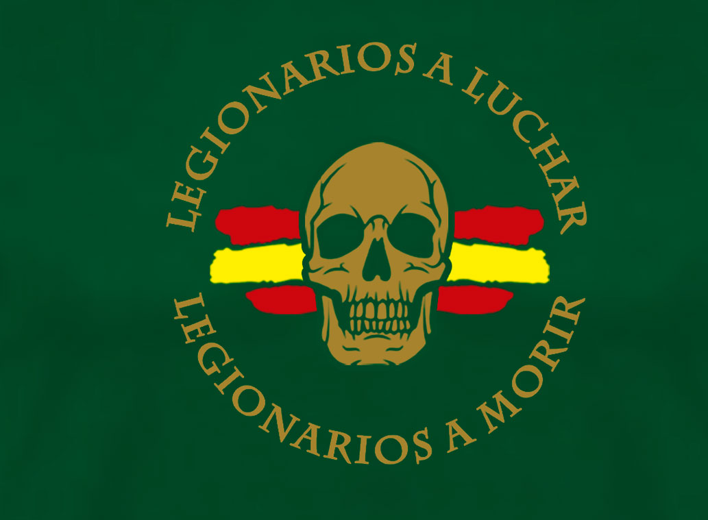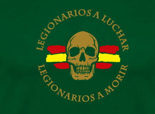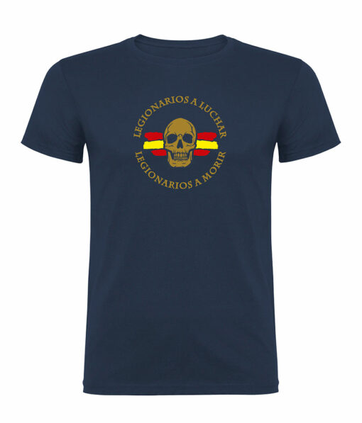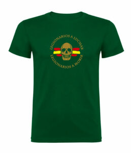 Camiseta básica UNISEX de manga corta, 100% algodón. , desde la talla S hasta la 2XL. En color verde o azul marino, con Frase Legión, Calavera y Bandera.