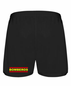 Pantalón corto deportivo con cinturilla elástica ajustable con cordón interior y pespunte de seguridad. En color negro, con Logo Bomberos en vinilo de alta calidad