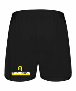 Pantalón corto deportivo con cinturilla elástica ajustable con cordón interior y pespunte de seguridad. En color negro, con Logo Bomberos en vinilo de alta calidad
