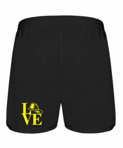 Pantalón corto deportivo con cinturilla elástica ajustable con cordón interior y pespunte de seguridad. En color negro, con Logo Bomberos LOVE en vinilo de alta calidad