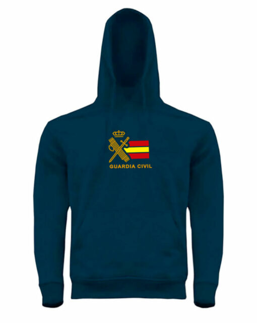 Sudadera unisex con capucha y cordón de ajuste a tono En color azul oscuro. Con logo GUARDIA CIVIL bandera. Tallas desde la XS (11/12 años) hasta la XL.