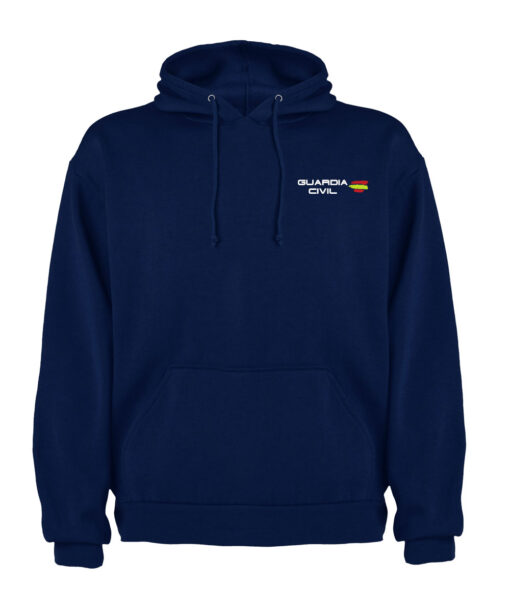 Sudadera unisex con capucha y cordón de ajuste a tono En color azul oscuro. Con logo GUARDIA CIVIL bandera. Tallas desde la XS (11/12 años) hasta la XL.