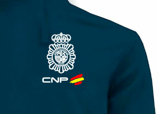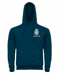 Sudadera unisex con capucha y cordón de ajuste a tono En color azul oscuro. Con Escudo POLICIA BANDERA. Tallas desde la XS (11/12 años) hasta la XL.
