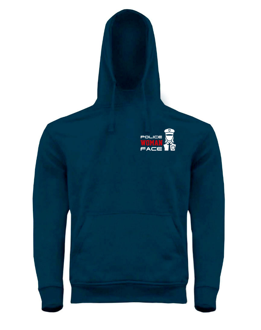 Sudadera unisex con capucha y cordón de ajuste a tono En color azul oscuro. Con logo THE POLICEWOMAN FACE 2021. Tallas desde la XS hasta la XL.